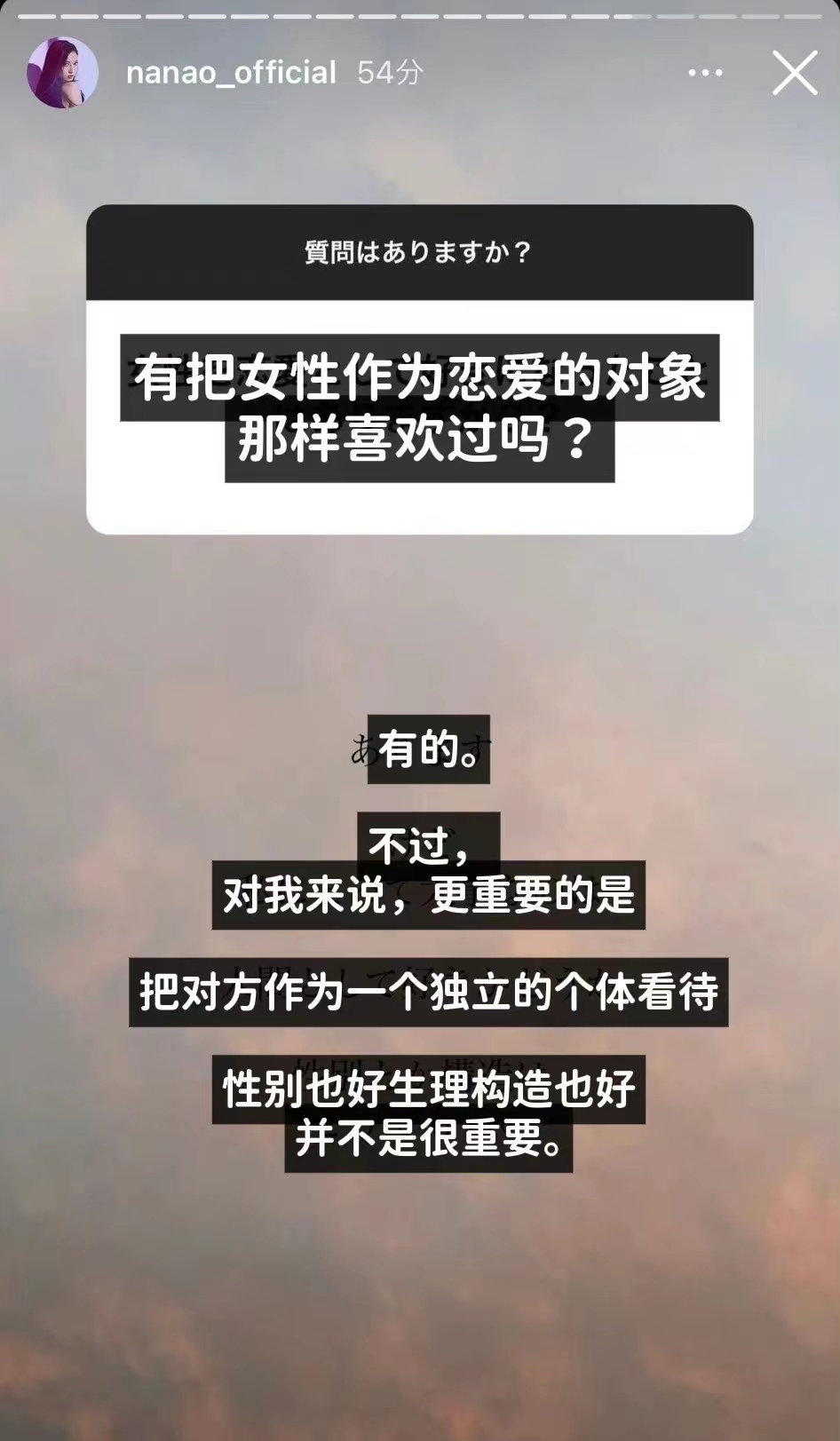 还进一步表自己喜欢一个人是把ta当做独立个体看待的,性别和生理构造不是考虑的重点。