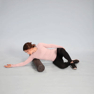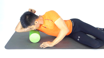 3、对侧手推地移动身体,使泡沫轴的滚动范围从肘关节到肩关节。