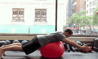 1、俯卧趴在瑜伽球上,双臂伸直,分别指向10点钟和2点钟方向,拇指朝上。