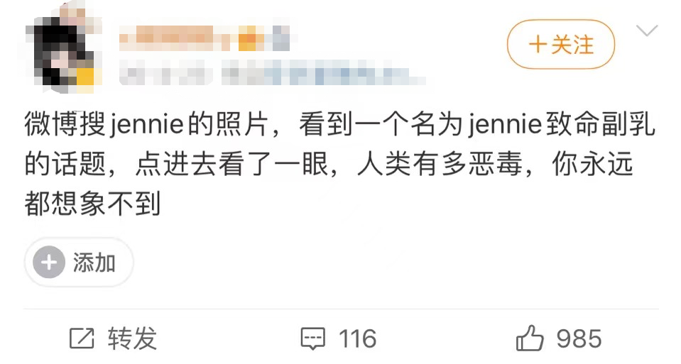 甚至有网友表示,在一个名为Jennie致命副乳的话题里,网暴的恶毒言论让人难以置信