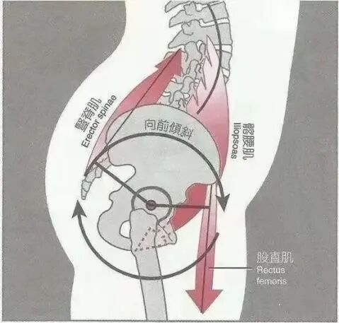 而紧张的髂腰肌就会往下拽着骨盆,于是就导致了骨盆前倾。
