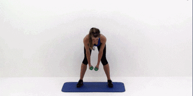 1、双手各握一哑铃,腿打开站立,身体向前倾,直到胸口和地面平行。