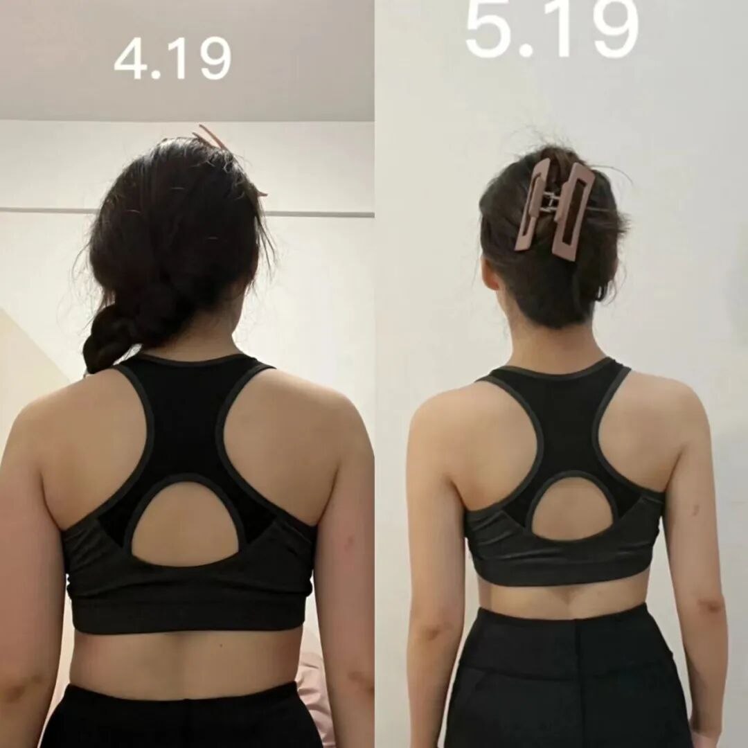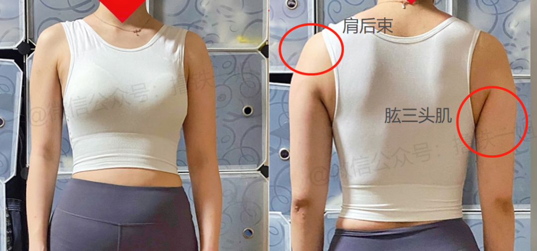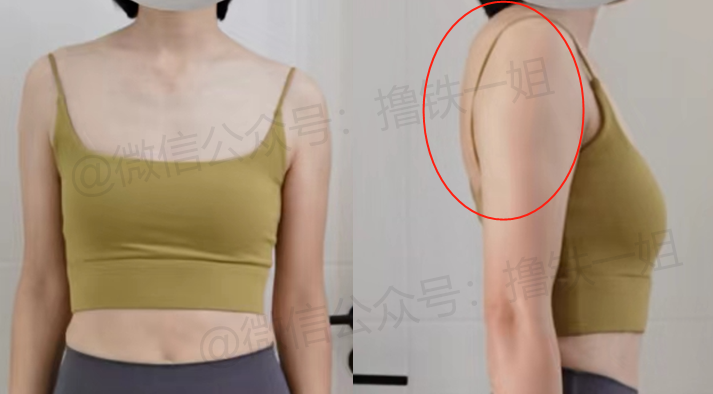 △比如这个姐妹就很瘦且不圆肩,但她的肩胛骨没在正常位置,导致手臂和背部有相连的感觉。如果圆肩,线条就会看起来更圆。
