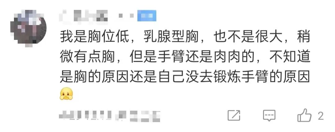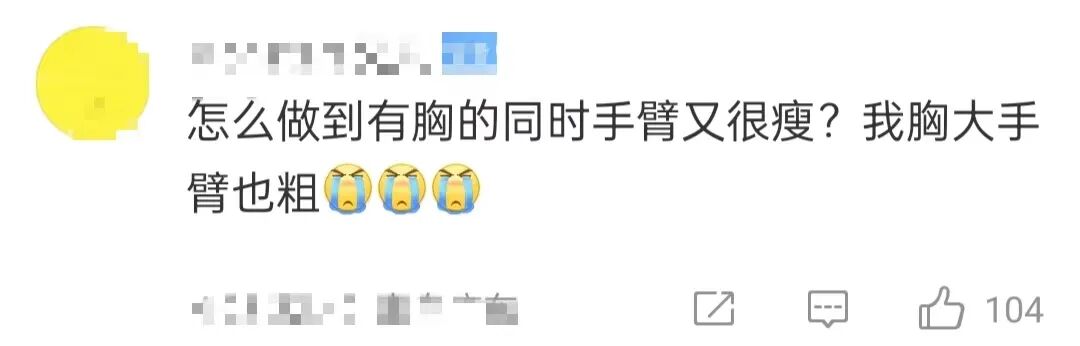 视频热评第一条就是询问她是如何做到有胸的同时手臂又很细的。