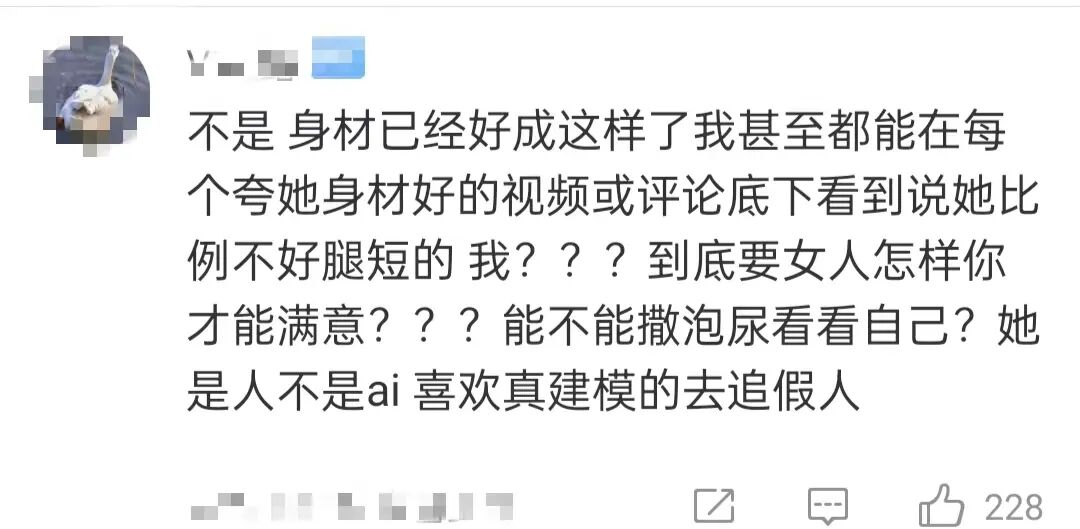 但果不其然,就算是这样的身材,部分网友还是能发现盲点——腿未免也太短了吧,居然还有明显的溜肩??