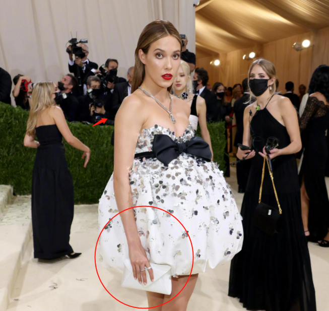 但当她处于肱骨内旋的瞬间时,手臂后面的肉也会外翻,导致手臂的视觉效果出现变化👇(注意看,此时她拿包的手掌就是向后的)