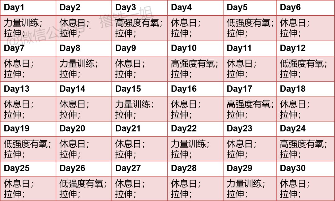 ③身体有过严重硬性损伤(比如膝盖、脚踝、腰椎等地方),对自己身体状况比较担忧的姐妹,把计划中所有的高强度训练换成低强度有氧。如果医生嘱咐不能做就暂时不要做。