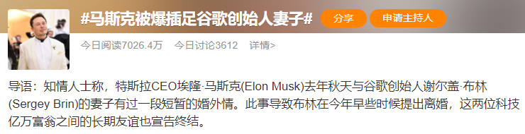 今天更是凭借和谷歌创始人妻子的非正当爱情故事上了微博的小热搜......