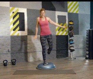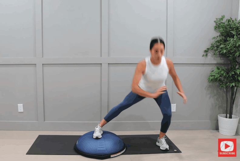 1、站姿双脚打开,右脚踩在波速球弹力面。2、吸气,左脚向左侧弓步下蹲。3、呼气,右脚支撑,摆臂站起提左膝。4、整个过程保持腹部收紧,每边20个,做2组。