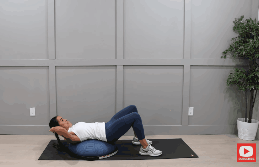 1、仰卧于波速球弹力面,双手置于耳侧,双脚打开与肩宽。2、呼气,收紧腹部,同时让身体对侧肘和膝相互靠拢。3、吸气,还原。4、一组20次,做3组。