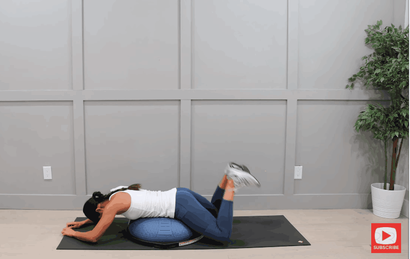 1、俯卧于波速球弹力面,双脚屈膝,脚跟靠拢。2、脚往上蹬,做一个伸髋的动作,呼气,感受臀部收缩,臀部发力抬起脚。3、吸气,还原。4、一组20次,做3组。