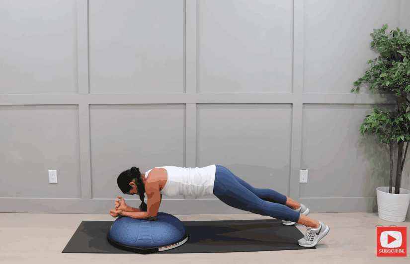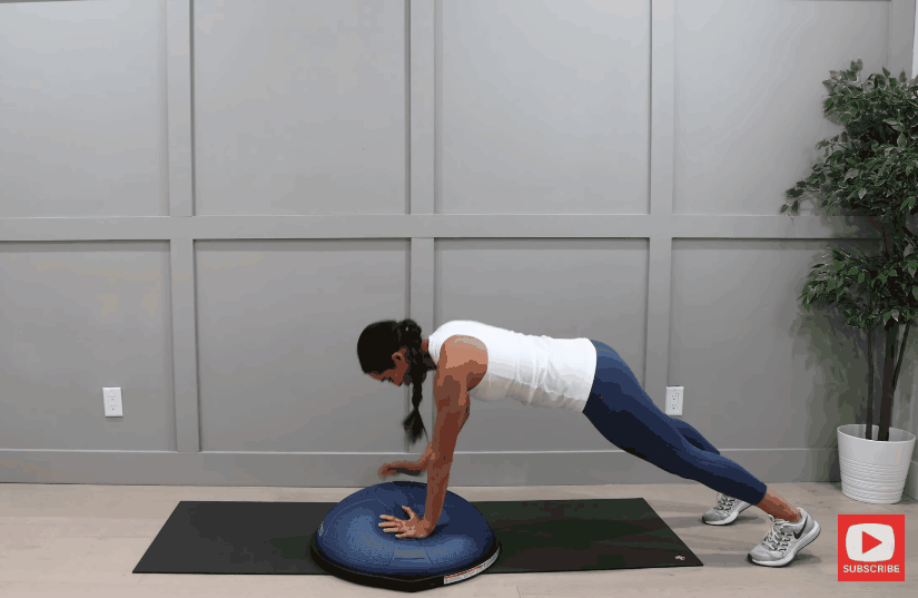 1、波速球弹力面朝上,双手支撑在球面上,保持腹部收紧,背部平直。2、做动态平板支撑,整个过程尽量不要让身体出现太大的晃动幅度。3、一组20次,做2组。