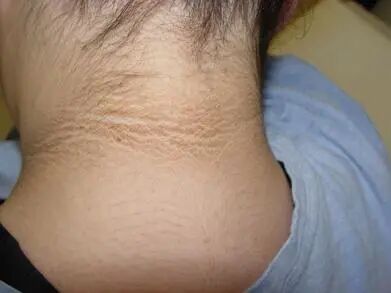 18、患有黑棘皮症,就是如下图脖子上看起来特别脏,好像很久没洗澡一样,甚至还会黑的油亮。(10分)
