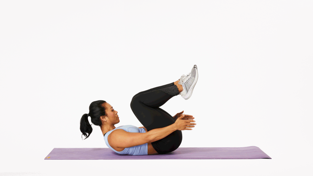2、蜷起身体,在臀后双手击掌1次,再回归起始位为完成1次;