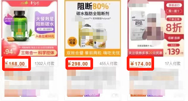 △某宝上种类繁多的饮食阻断剂,价格也是各不相同。