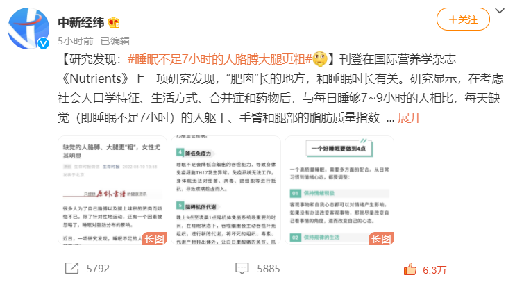 有研究发现「睡眠不足7小时的人胳膊大腿更粗」
