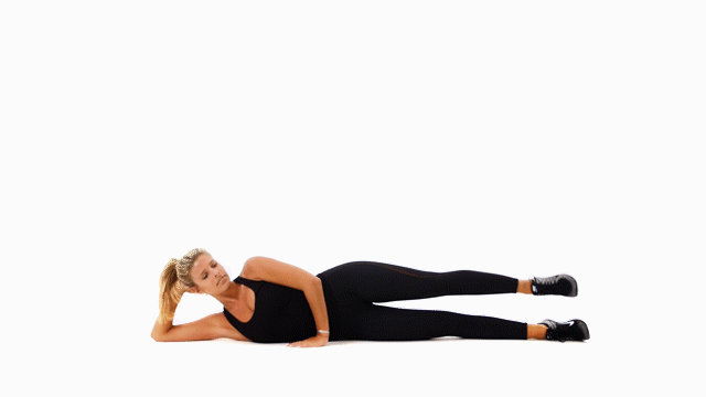 1、以左腿为例,从侧卧姿势开始,左手放在胸部前方的地板上稳定身体,保持身体成一直线;