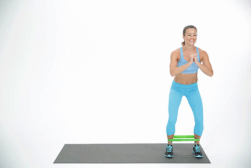 1、脚踝上可以套一个弹力带,双手放在胸前稳定上半身,上半身微微前倾,让臀部更加孤立,核心收紧;