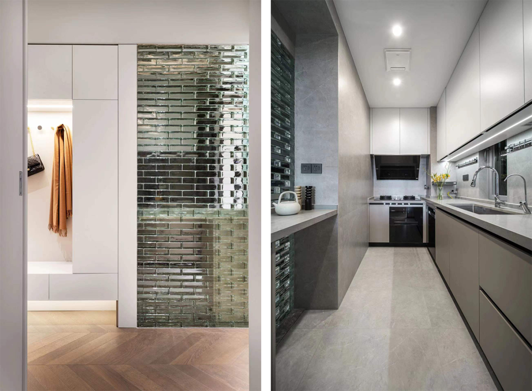 厨房与餐厅之间,选用玻璃砖作为隔断。