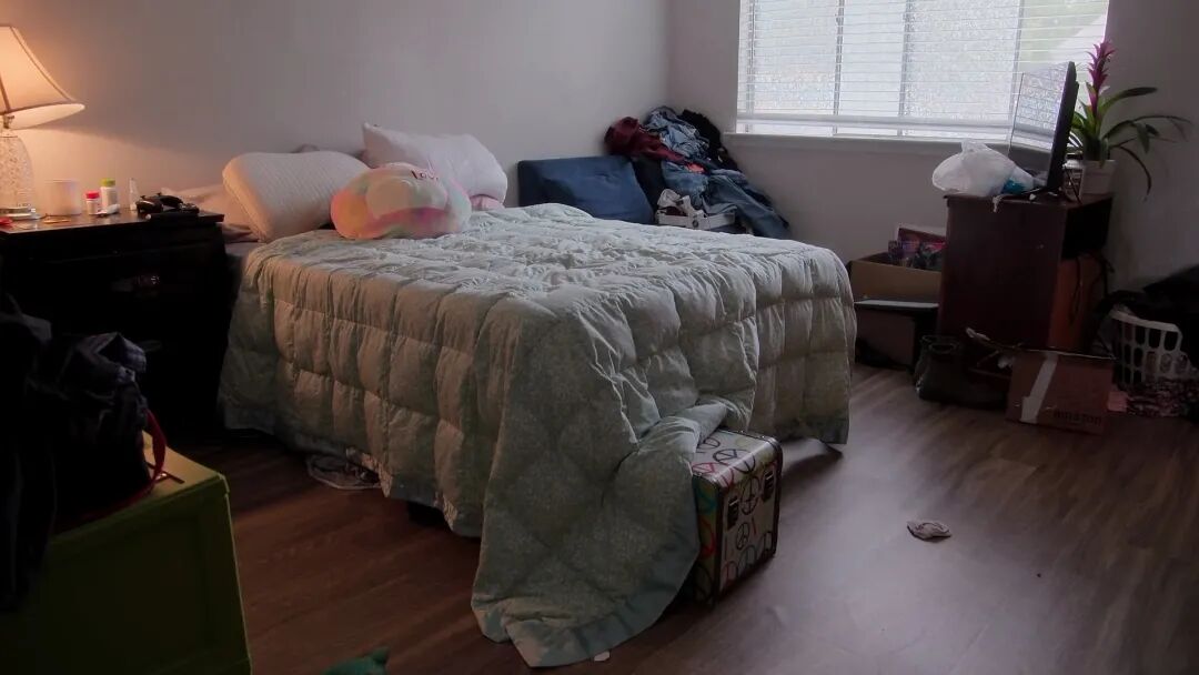 一个衣柜、一张床、几个堆满杂物的收纳柜,丝毫没有生活的气息。