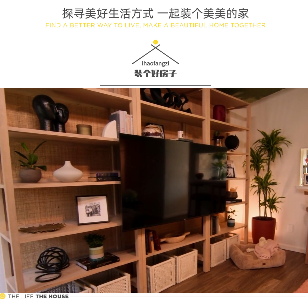 电视背景墙一侧也做了整面开放式储物架,增加收纳、陈列的功能。