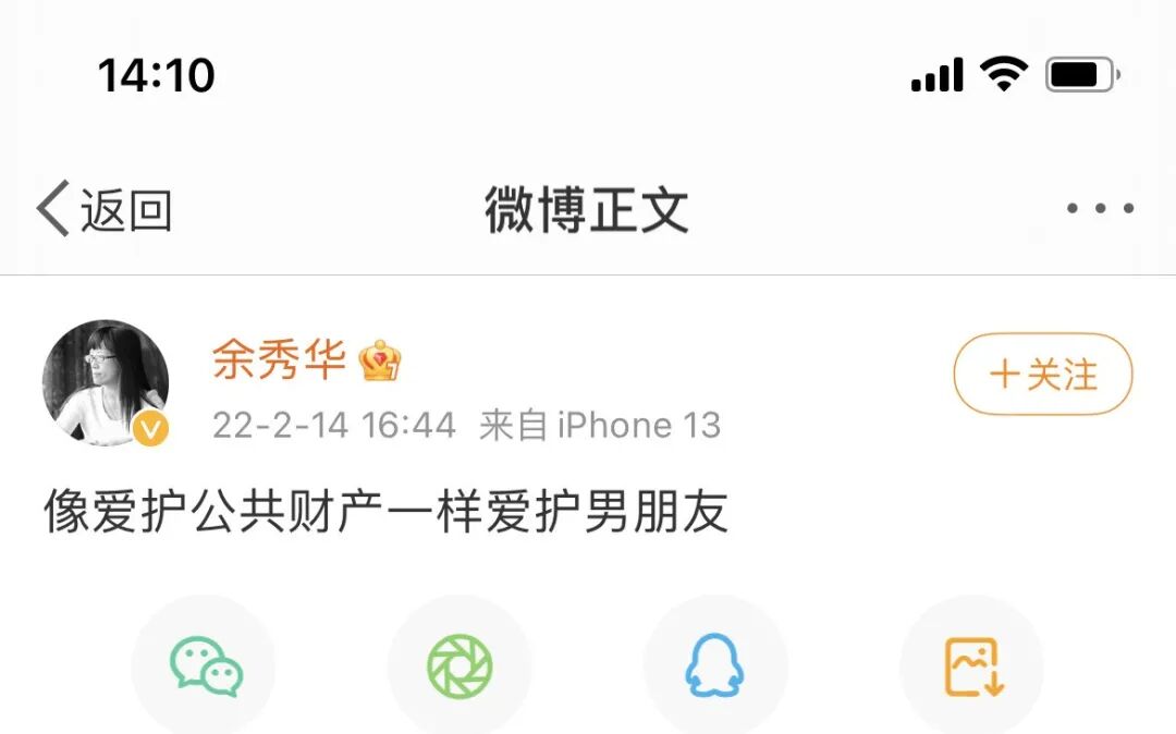 46岁的余秀华在微博发布了这样一条微博:像爱护公共财产一样爱护男朋友。