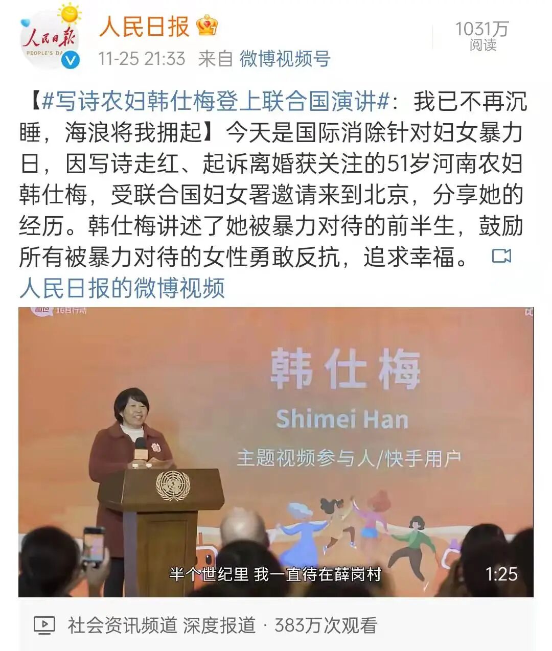后来写出了名气,还在去年11月25日的“国际消除针对妇女暴力日”,受到联合国妇女署邀请,登上了联合国的演讲台,分享自己抗争不幸婚姻的经历。