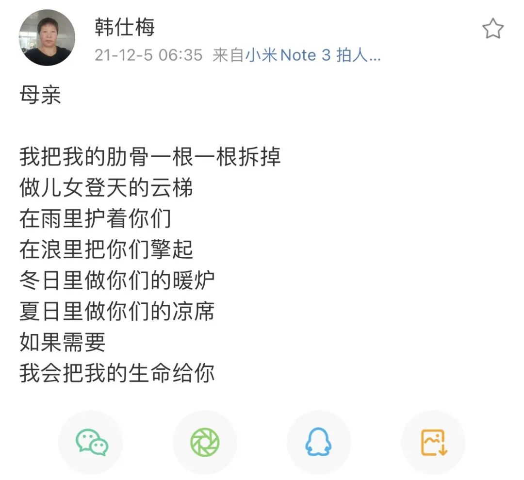 隔着手机,没有人在意她是个毫不起眼的农妇,很多人夸她的诗写得好,喊她“韩老师”,这让从未被肯定过的韩仕梅感到无比快乐。