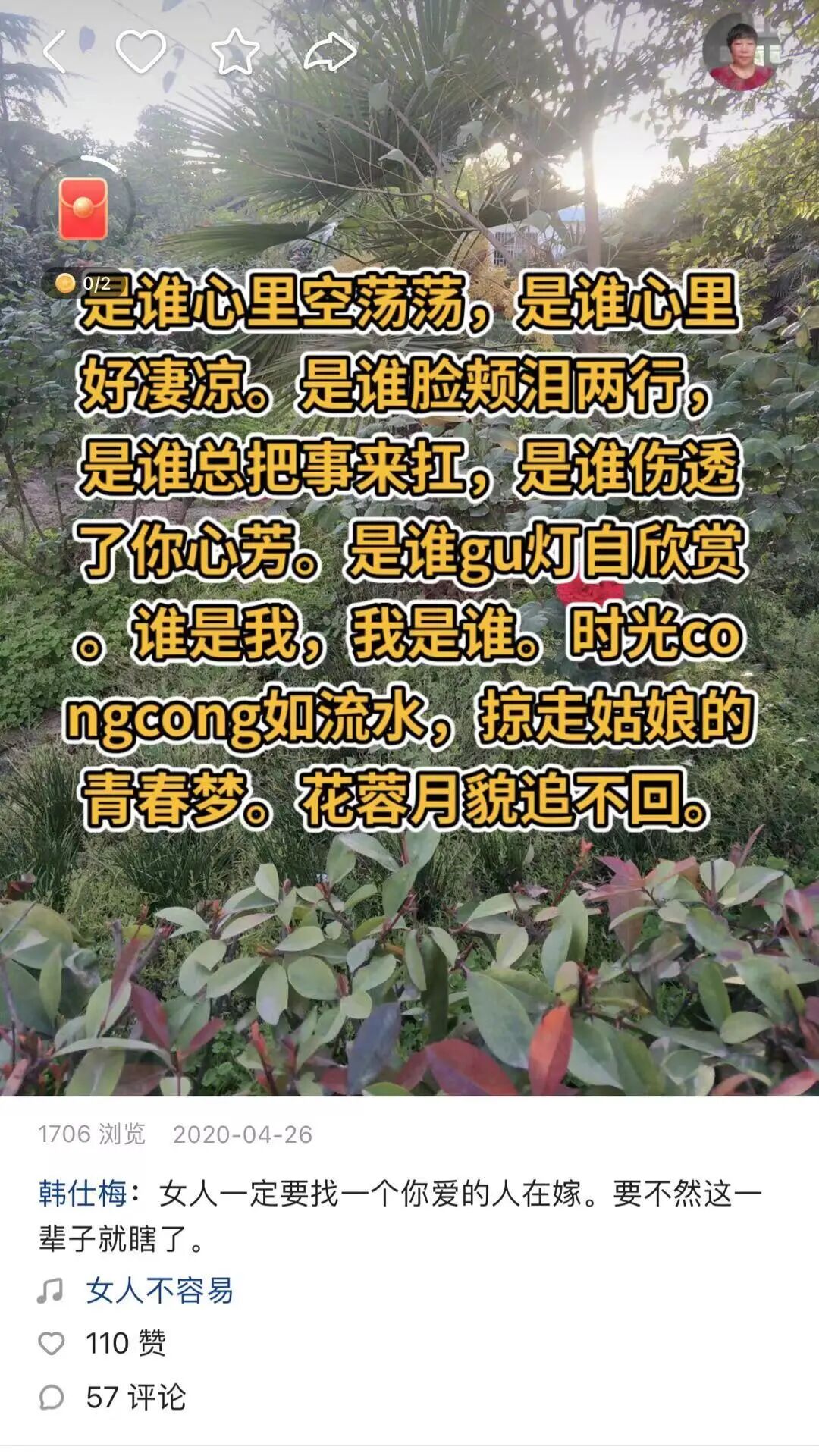 但那个时候,韩仕梅的心已经冷透了,她写了一首名叫《是谁心里空荡荡》的诗,来形容自己不知道怎么撑过来的这段日子:谁是我,我是谁,时光匆匆如流水。