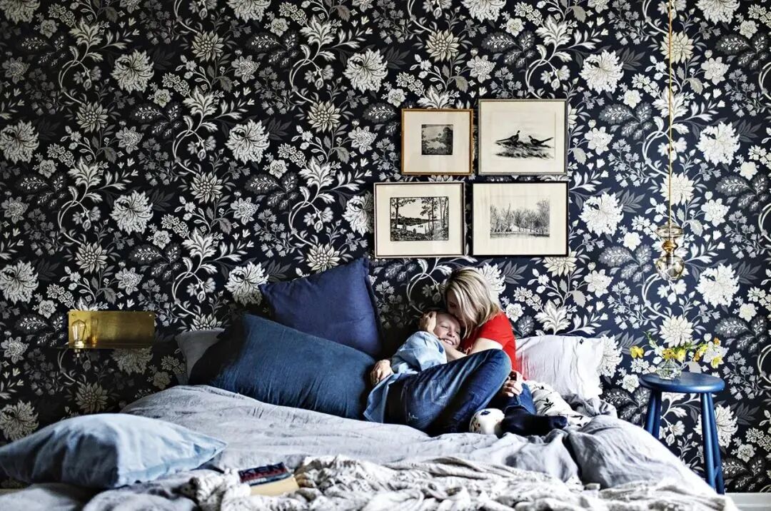 另一侧是音乐与阅读区,深蓝色碎花壁纸将其与休闲区区分开来,营造出舒适、沉稳的感觉。