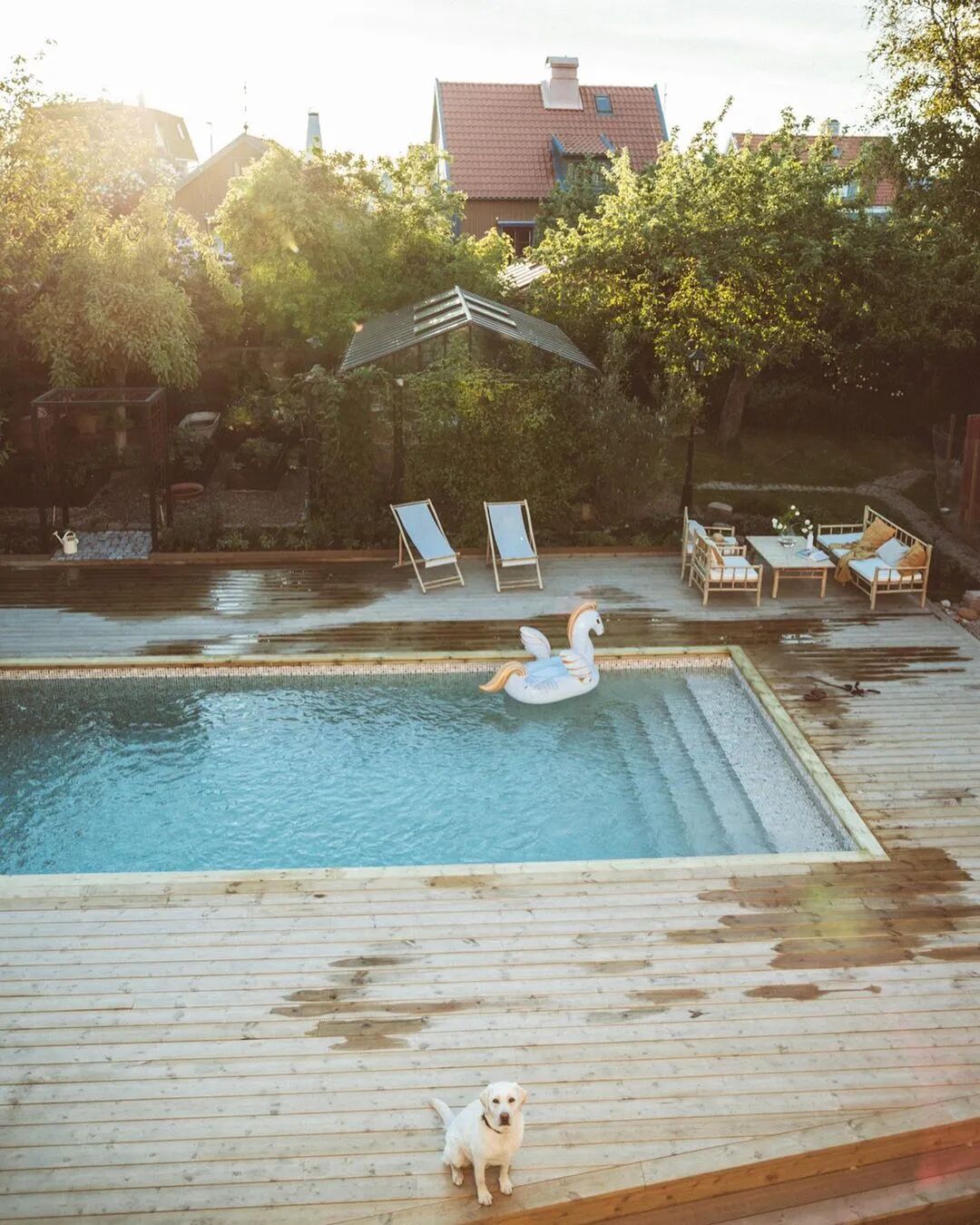 房子后有个超大的院子,里面还有个露天游泳池,周围被茂盛的树木包裹。