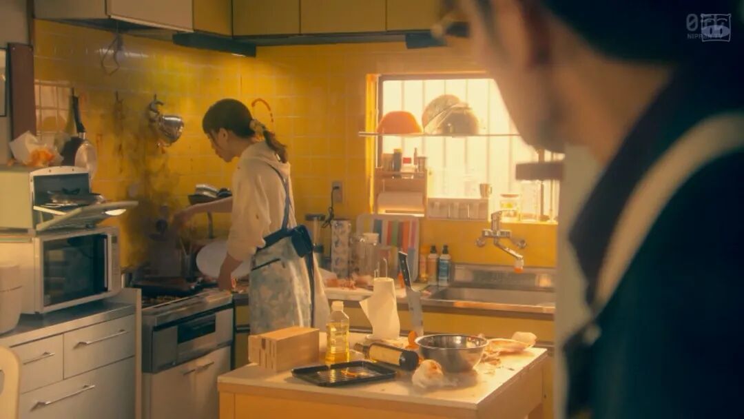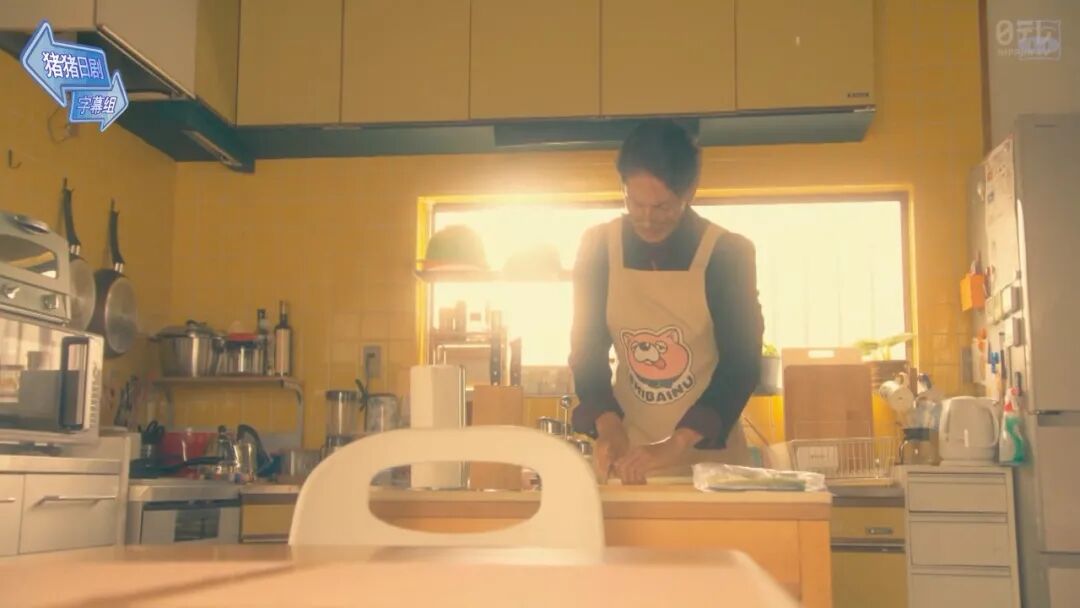 在岛台切菜、备菜时,身后的窗户透进来阳光,似乎阿龙整个人都被一种“母性光辉”给包围了,异常温馨。