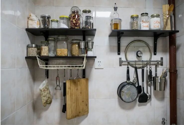 他们用买来的二手玻璃瓶,收纳米、油、面粉、干果等各种粮食,整齐有序地摆放在置物架上。