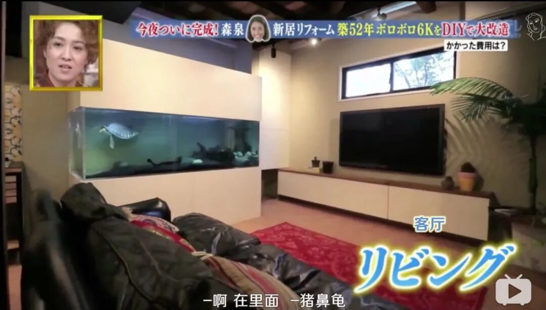 值得一提的是,客厅与厨房相连处森泉打造了一面墙的大鱼缸,里面饲养着森泉喜爱的猪鼻龟。