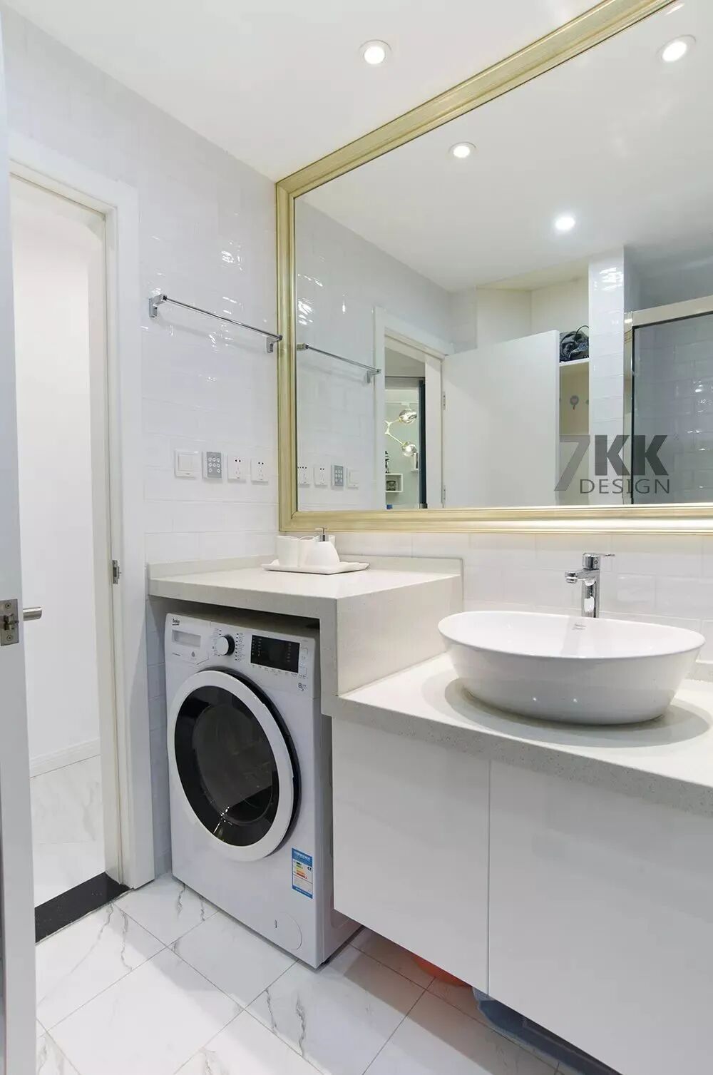 4.6㎡的卫生间,同样也是以清爽的白色为背景色调,搭配金属元素的镜框,显得非常精致。