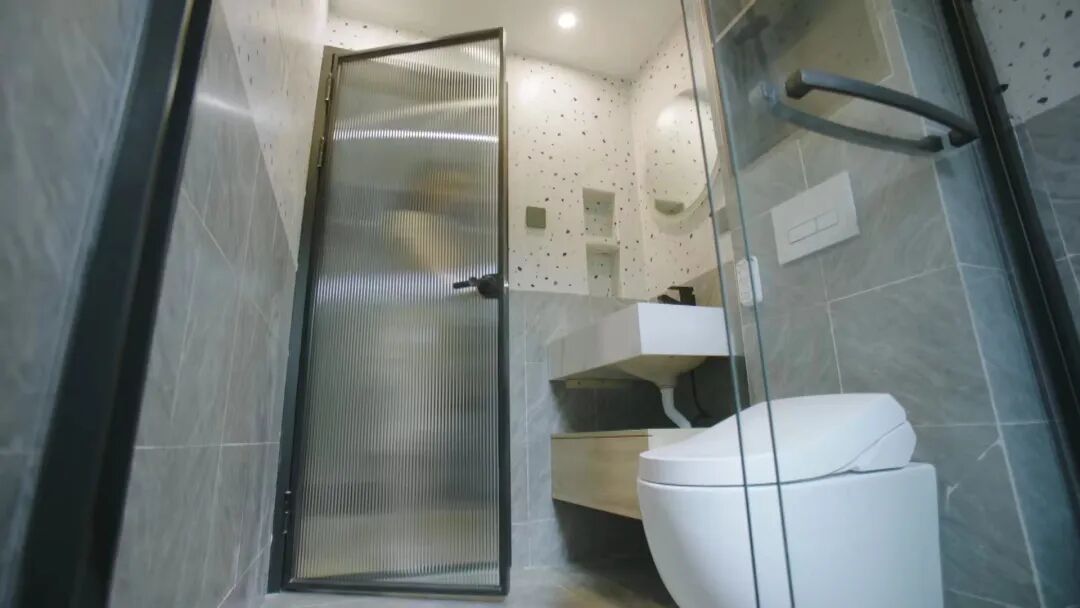 卫生间在进门右手边,黑框长虹玻璃门透光不透人。