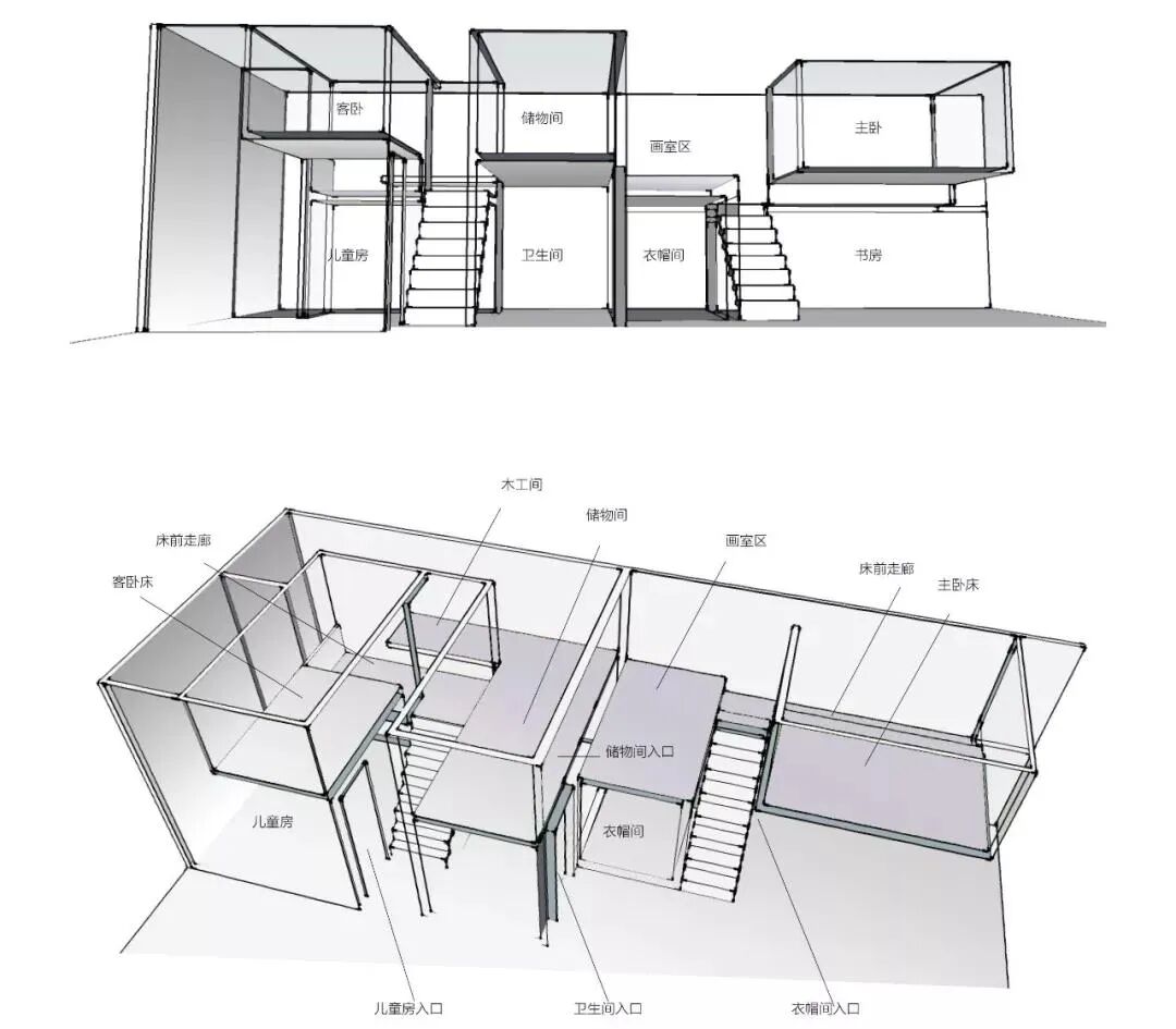 卧室放在二层,仅满足简单的储物和睡眠要求即可。