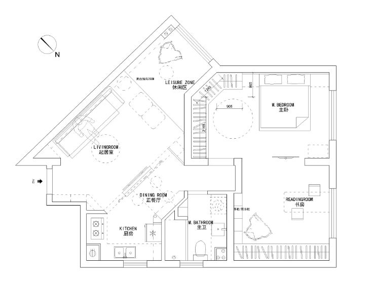 男屋主处于事业上升期,需要自己独立的书房,希望把卧室和客厅功能整合在一起;