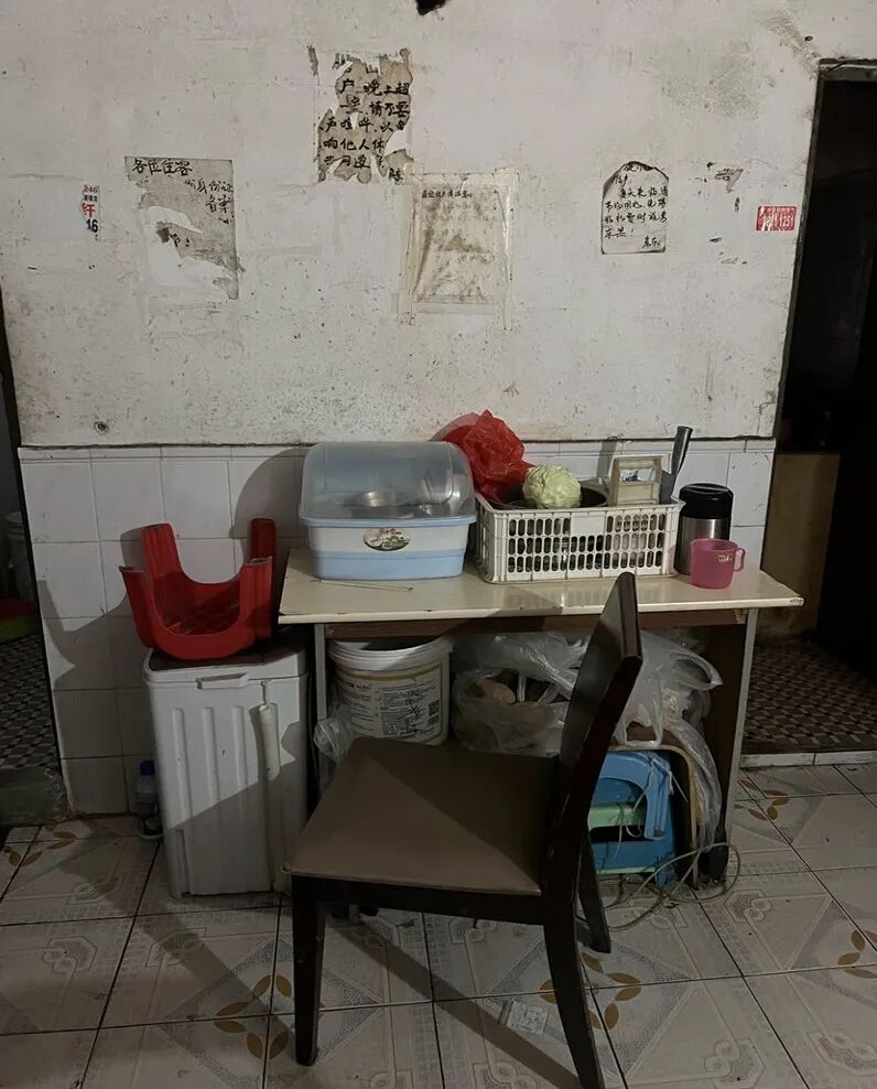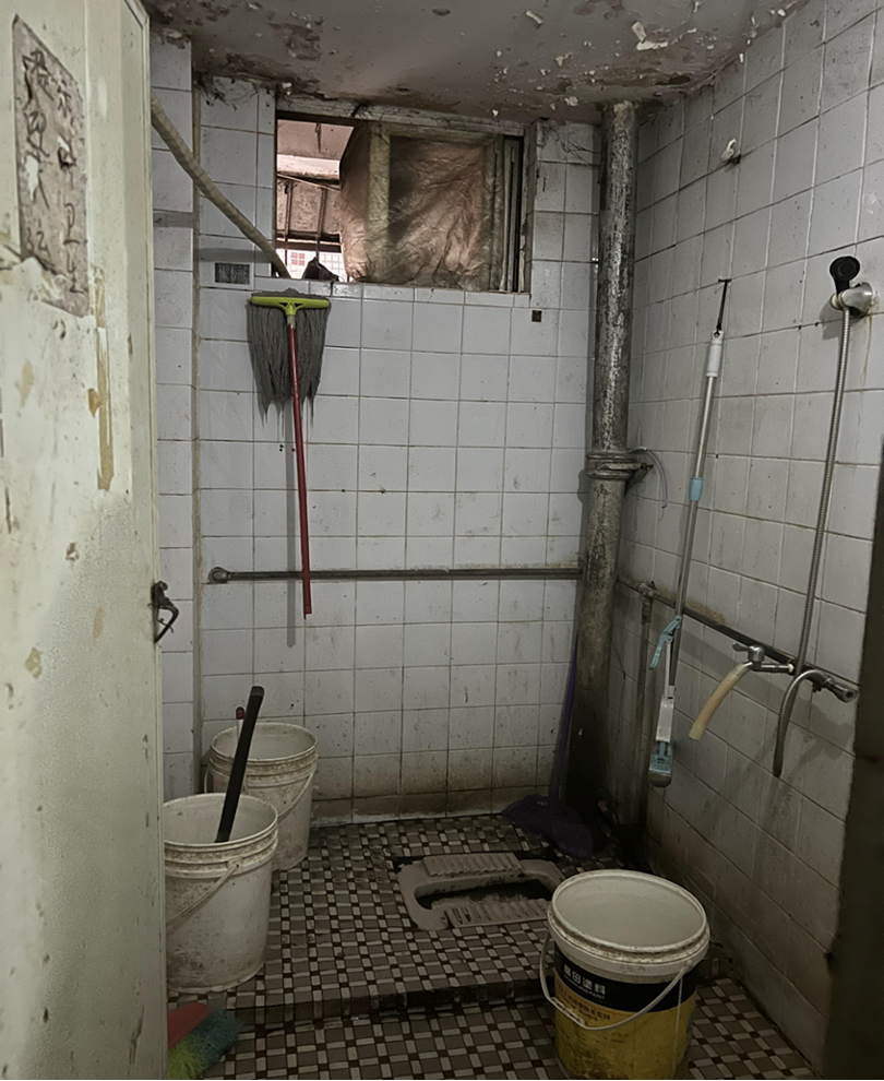 顶面墙皮脱落,墙壁瓷砖和蹲便早已泛黄发黑,裸露的水管上霉迹斑斑,像极了韩国电影《寄生虫》中的半地下室。