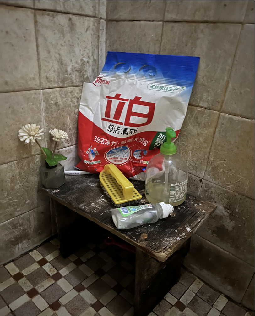 在厕所一角,满是污垢的墙壁下,不仅有整套的清洁工具,还有一瓶插着白色假花的香薰。