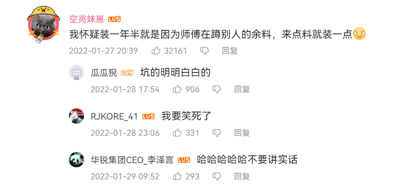 “我怀疑装一年半就是因为师傅在蹲别人的余料,来点料就装一点
