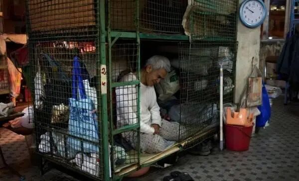 一位老伯住在满是灰尘的铁笼内,无法伸直双腿睡觉
