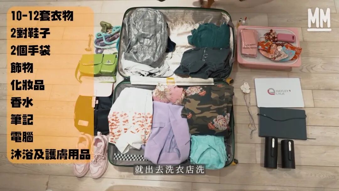 比如10-12套常用衣物、两双鞋子、两个手袋、简单的生活、护理用品等。