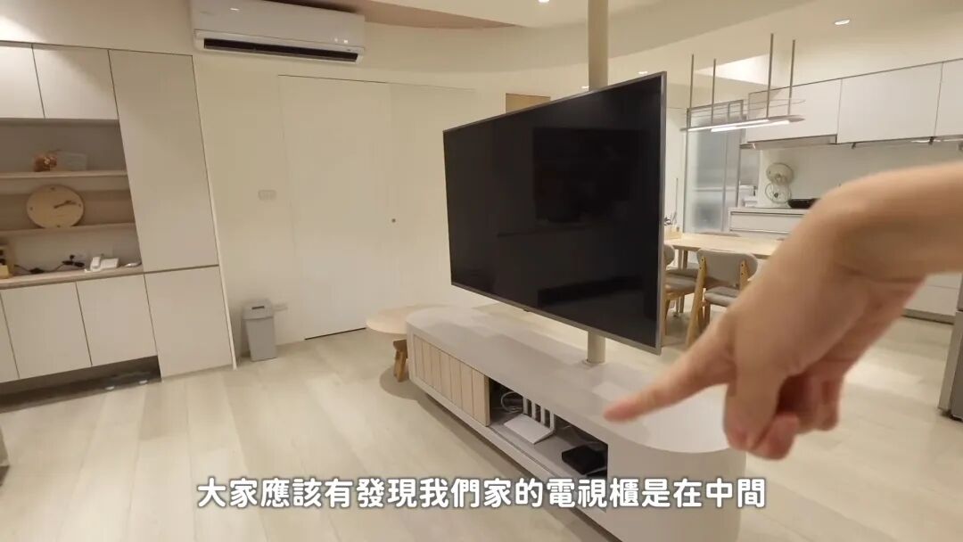 再比如,客厅的电视被处理掉后,就露出了光秃秃的墙面,无奈只能用更多的收纳架遮住,显得有点杂乱。