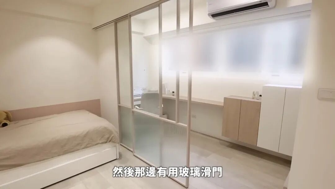 靠墙摆放一张单人床,靠窗处则设置成办公的区域,二者之间用玻璃滑门隔开,既能合理划分空间,又不影响采光。