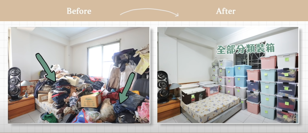 然后,学会将所有物品都陈列出来后,把相同属性和类型的东西摆放在一起,再根据价值和需求进行取舍,并且避免今后还出现类似的囤货行为,而不该只会一味的丢丢丢。