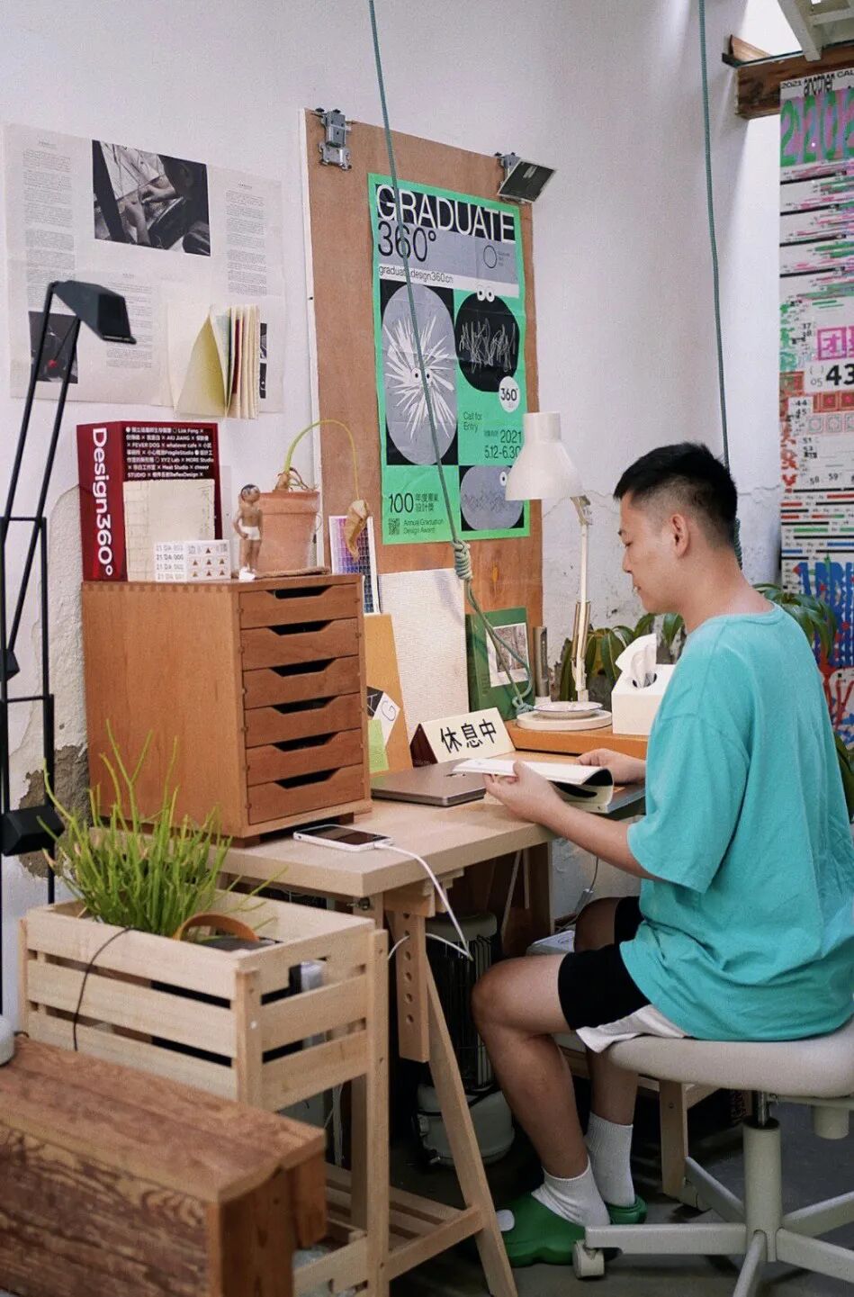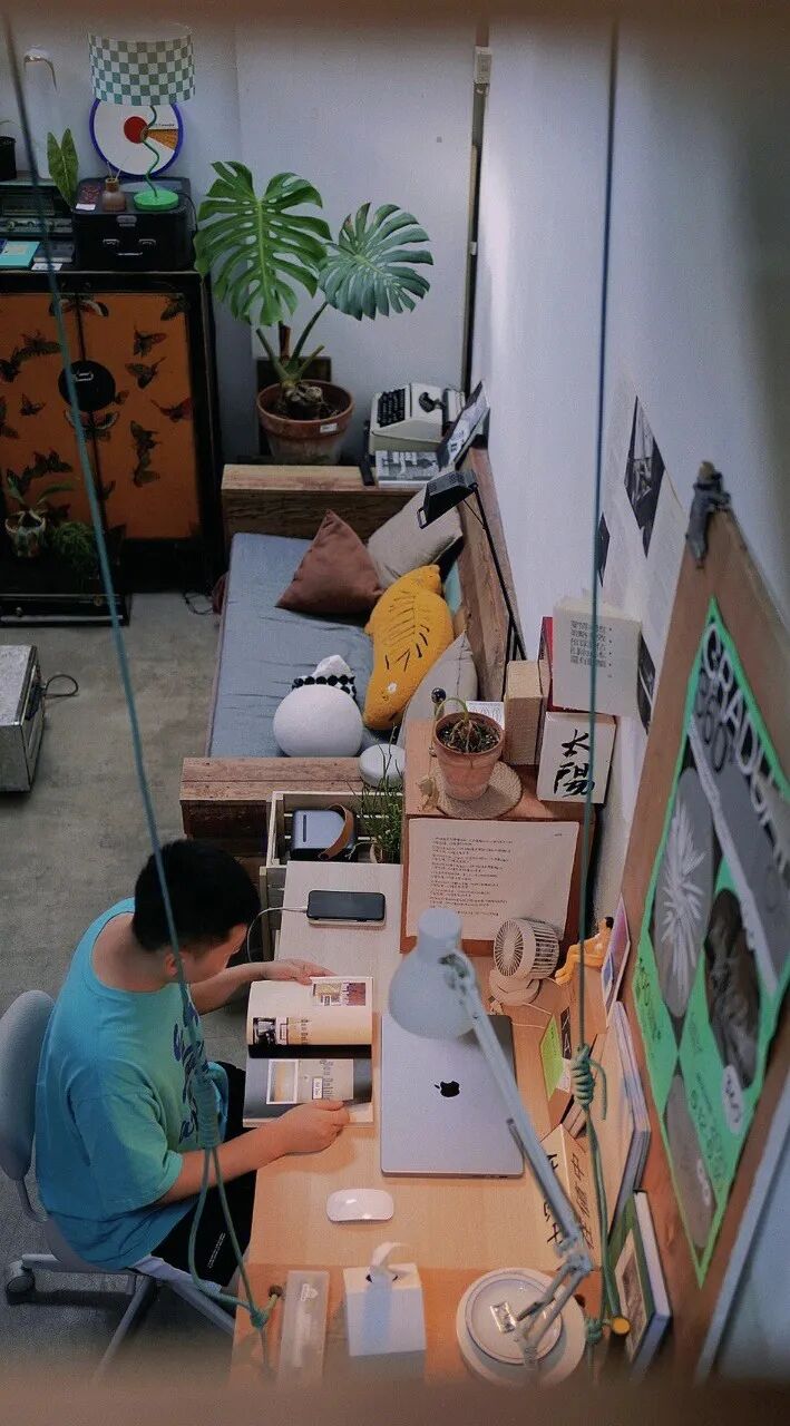 在书桌上摆好看的书和海报,因为它们本身就是很好的软装,但书籍海报选择也很重要,他选择的是黑白、木和绿色色系,这样不会太杂乱又有氛围。