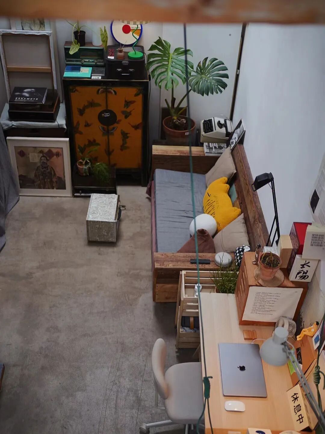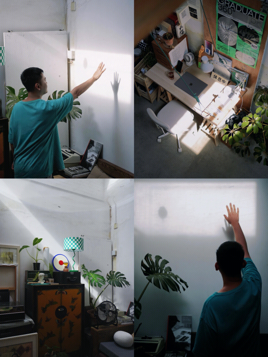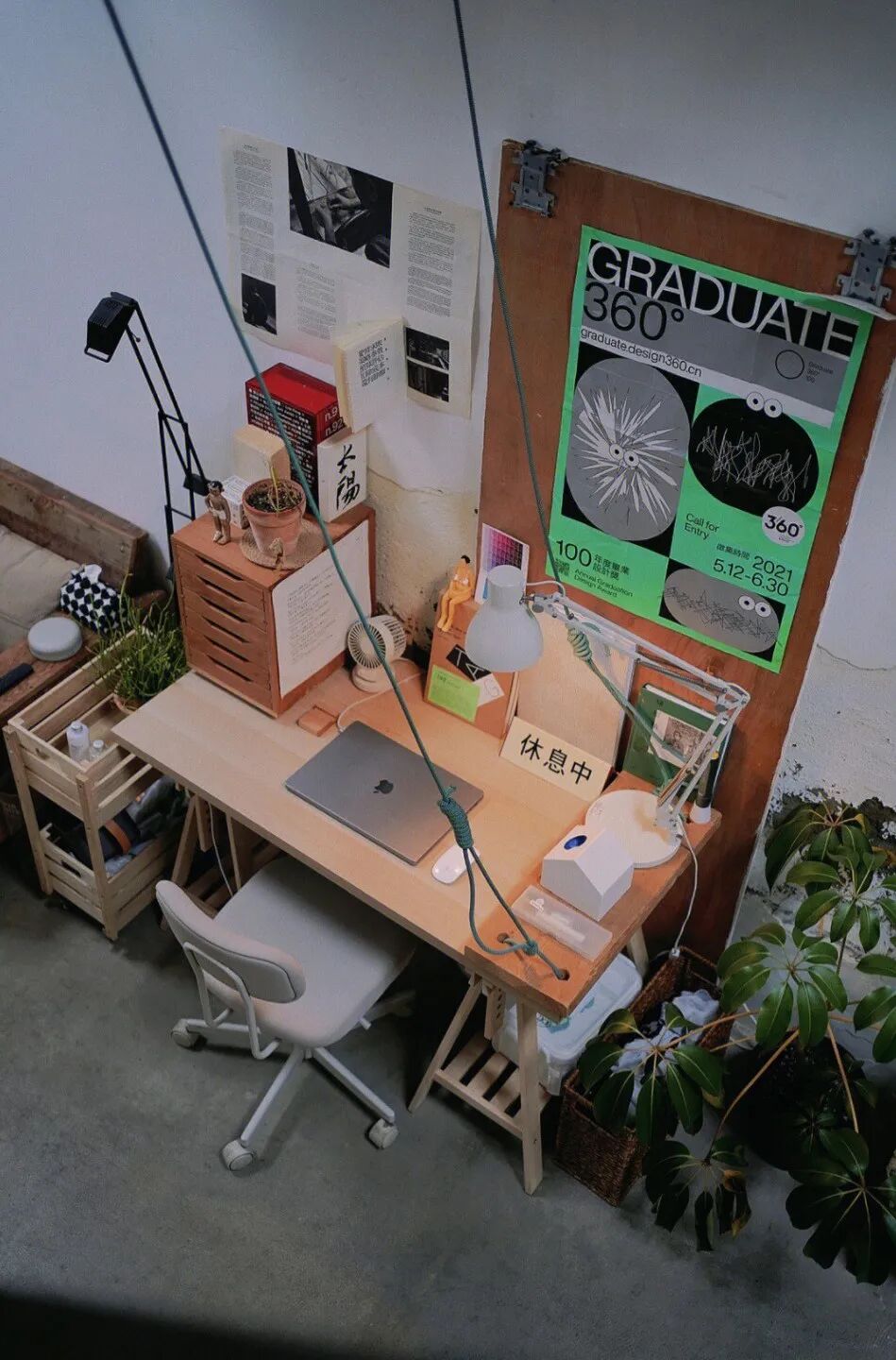 书桌、竖立木板和海报、木墨的抽拉柜及地面植物大叶伞,是主要的大物品,能将书桌结构撑起来。