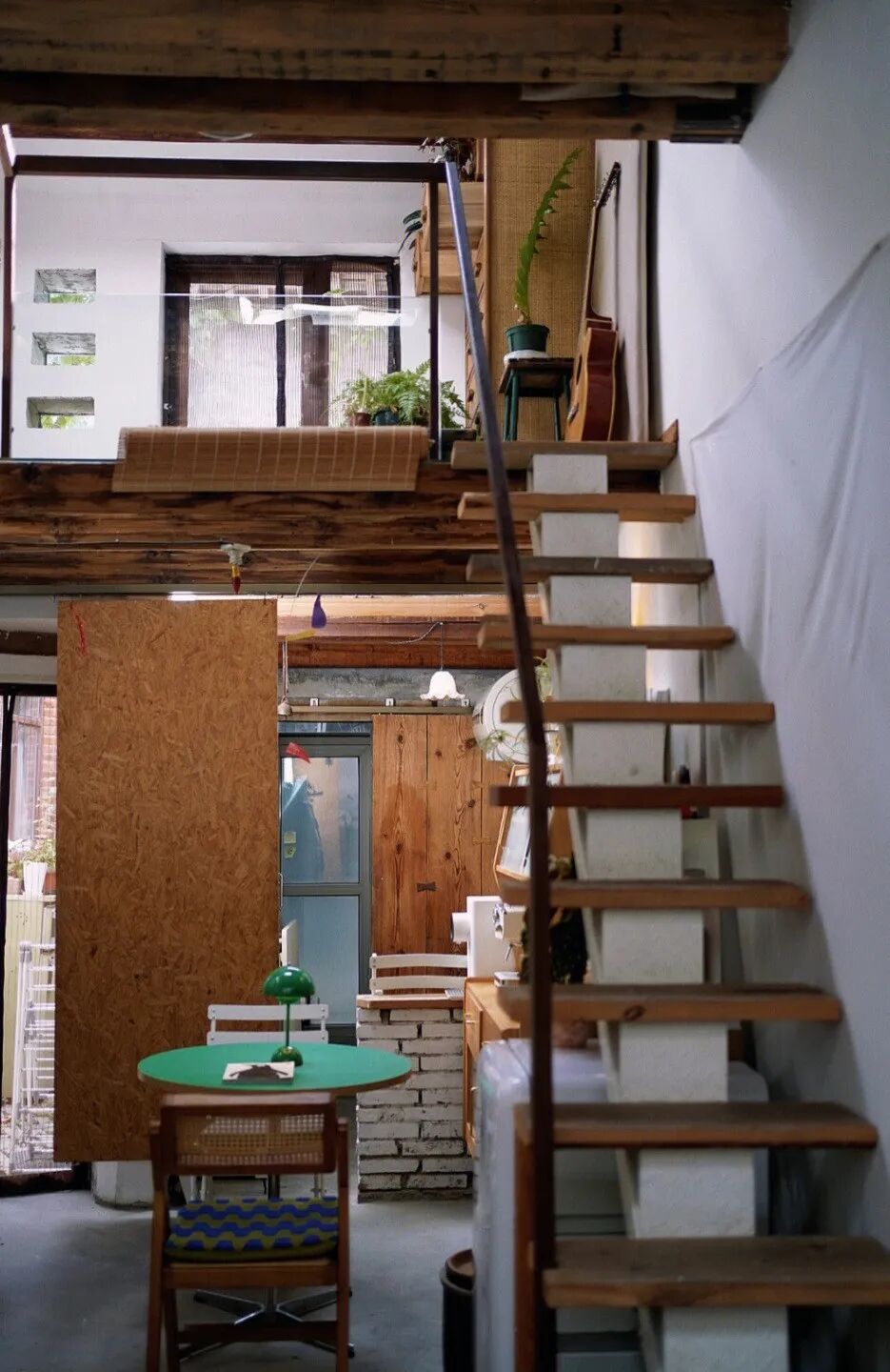 房子有很多木质材料,以太自己也有很多木质物件,木质能很好营造温暖氛围。竖立的木板是衣柜的门,将木板竖立在书桌前,有一个纵向空间,当作装饰也更有艺术感。