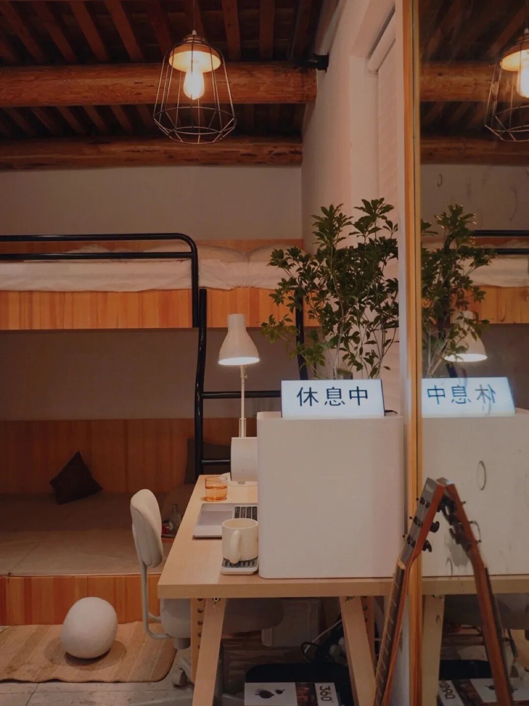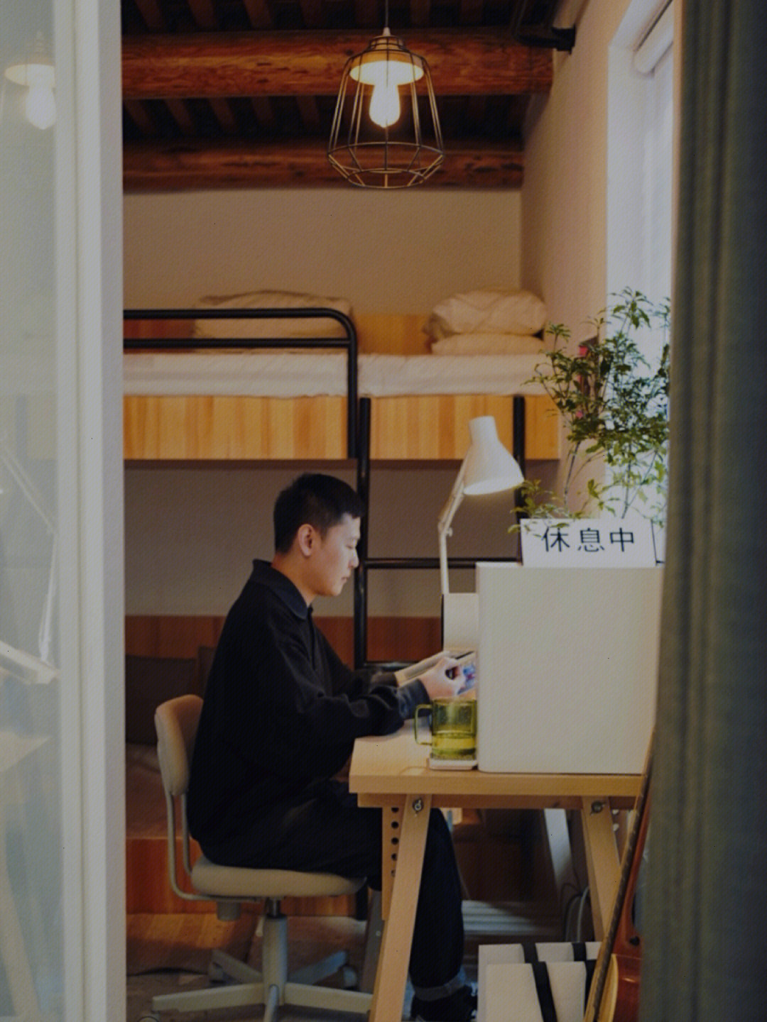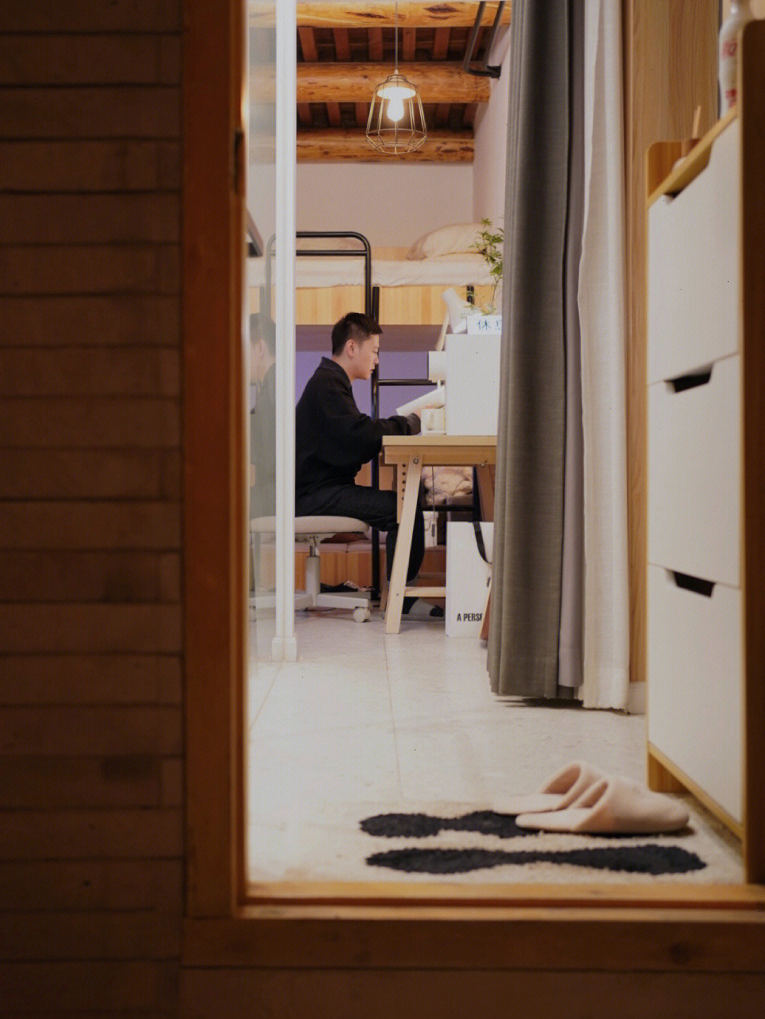 书桌那有一个木制秋千,但这个秋千挺占地方,他将它摆在书桌右侧当置物台,能放台灯、抽纸盒等小东西。